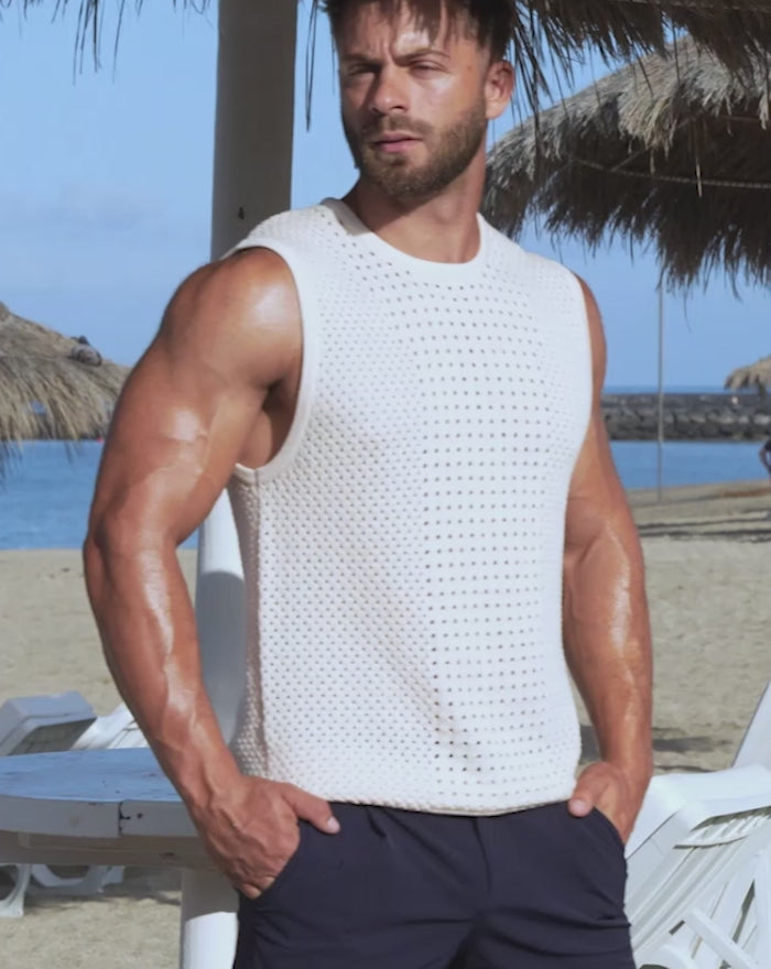 Crafted with intricate crochet knit patterns that exude charm and sophistication, its lightweight, airy design and relaxed fit ensure comfort while allowing easy movement, while the sleeveless design offers freedom and versatility. Pair it with your favourite shorts for a refined, laid-back look that effortlessly transitions from day to night; embrace the season's warmth and make a statement wherever you go.