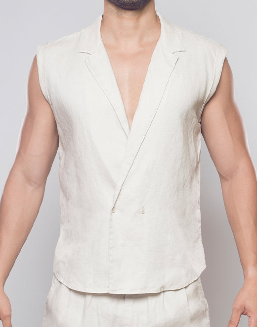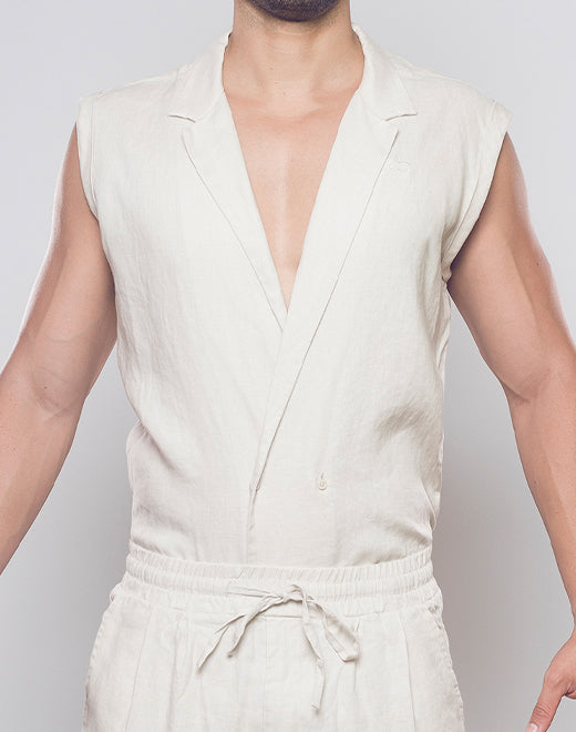 飘逸亚麻单纽扣裹身背心 - 米色