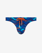 Printed blue textured swim thong on a white background